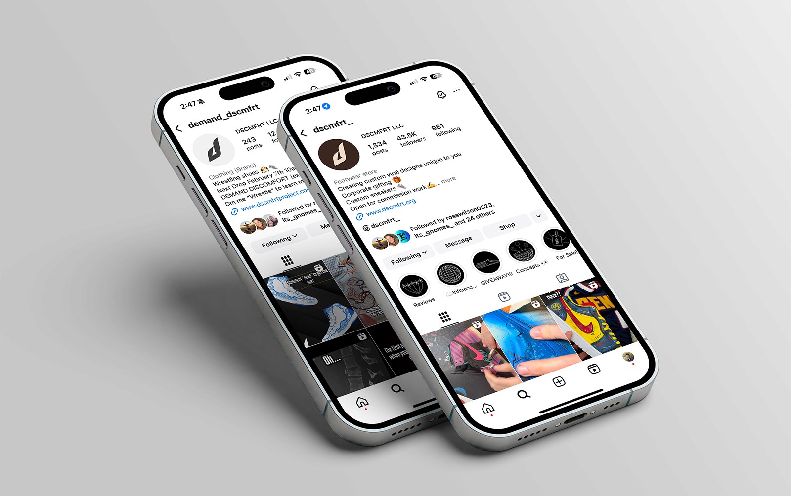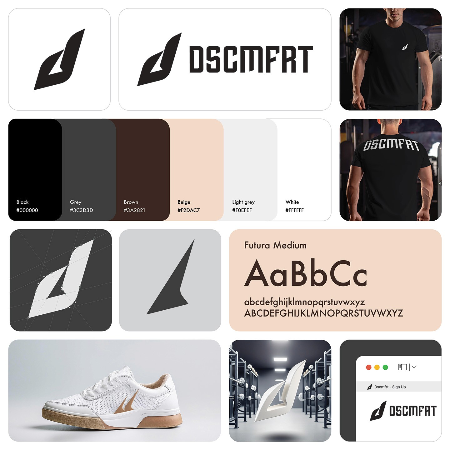In order to resonate with the target customer, and to stand with competitor brands such as Gymshark, Nobull, and Nike, the logo had to be simple, yet convey the impactful message of its name — Dscmfrt. The direction we decided to head in included a thorn, hidden in the negative space of the first letter of the name.